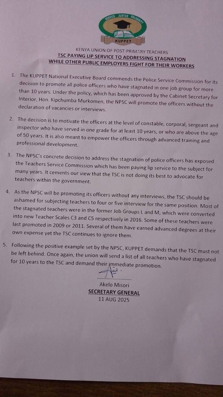 The Kenya Union of Post-Primary Education Teachers (Kuppet) has recently directed pointed criticism towards the Teachers Service Commission (TSC), highlighting the alarming issue of teacher stagnation within the same job groups. This situation is particularly concerning as many teachers have remained in their positions for over a decade, with some being stuck since 2009 or even 2011.