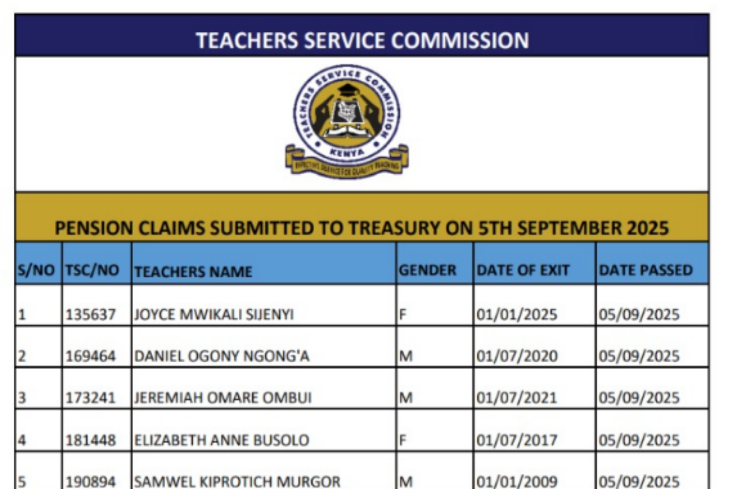 The Teachers Service Commission (TSC) has submitted 201 pension claims to the National Treasury for processing and payment, marking yet another attempt to ease the pension backlog for retired educators in Kenya. This submission, dated 5th September 2025, represents a crucial milestone for teachers who have been waiting—some for months, others for decades—for their retirement benefits.